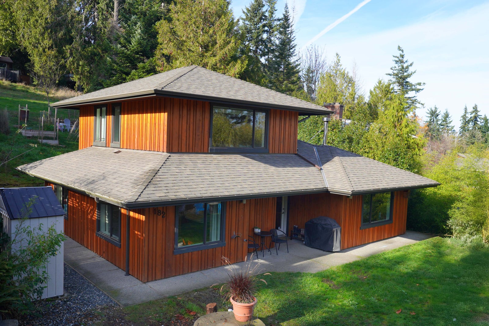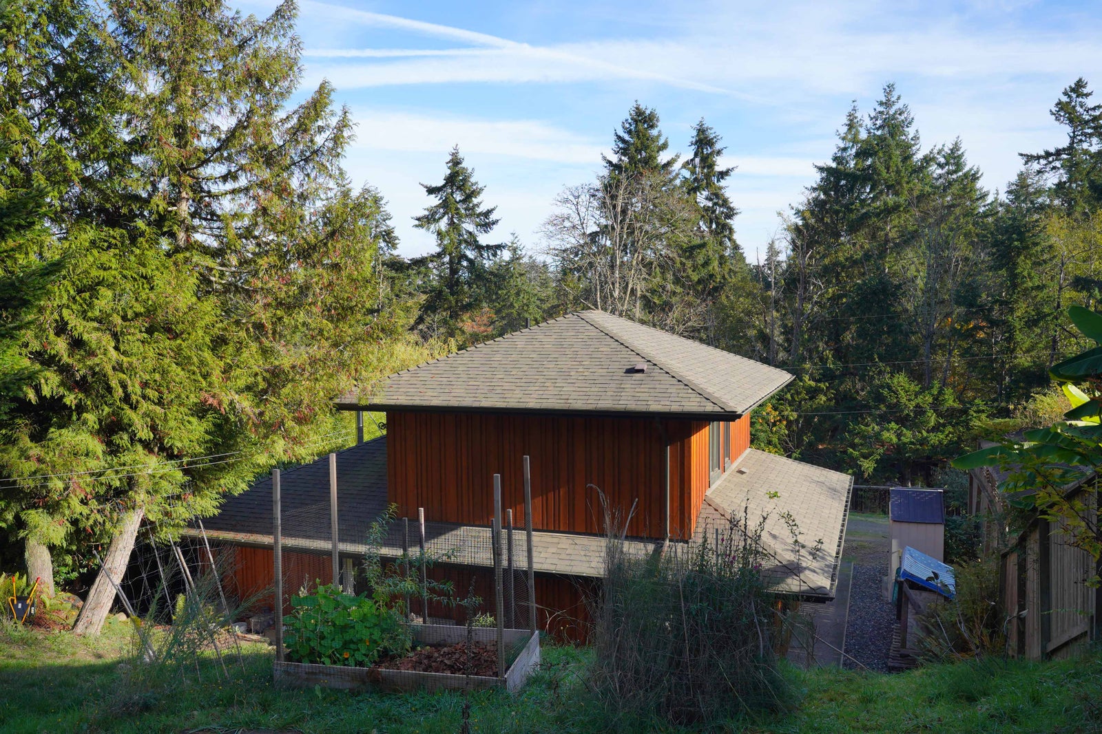 Cedar siding, generous roof overhangs, and an exposed-aggregate walkway wrap the exterior, giving the home a timeless character and practical weather protection. All of this is set just a few blocks from the beach, offering the ease of coastal living in a peaceful residential setting.